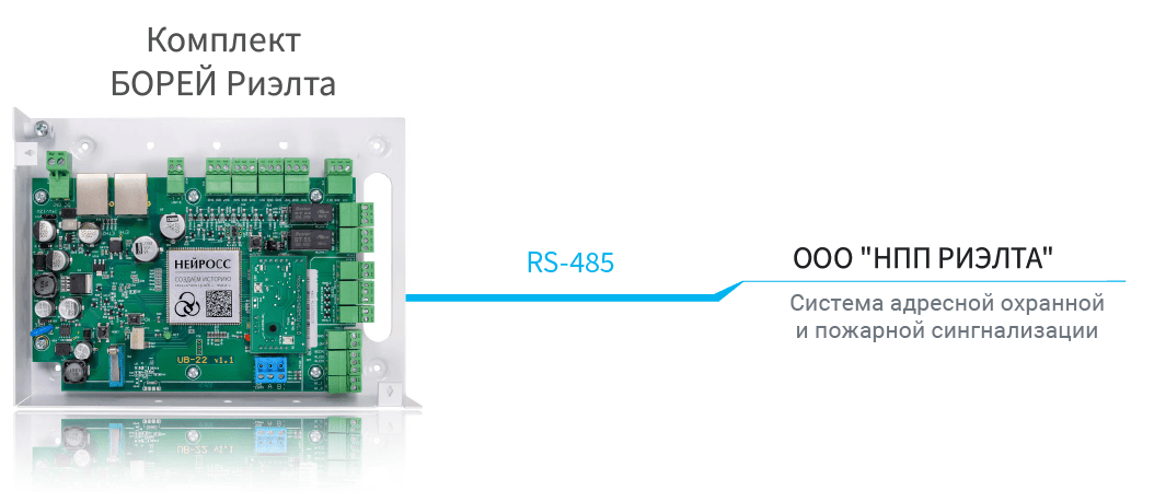 Комплект БОРЕЙ Риэлта предусмотрен для интеграции с адресными приборами ООО «НПП Риэлта», поддерживающего двухпроводный кольцевой адресный шлейф с протоколом обмена «Риэлта-Контакт-АДР» . Контроллер БОРЕЙ комплектуется коммуникационным модулем МК-RS485Р. Подключение к адресной линии осуществляется посредством координатора адресного шлейфа «КАШ-485».