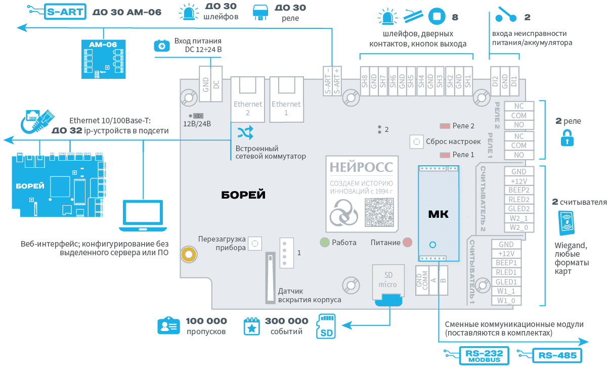 «Классический» контроллер БОРЕЙ на новой аппаратной архитектуре, обеспечивает подключение двух односторонних или одной двусторонней точки доступа. За счёт использования шины SART БОРЕЙ позволяет контролировать до 38 шлейфов сигнализации с контролем неисправности и до 32 реле. В комплекте БОРЕЙ Modbus за счёт коммуникационного модуля МК-RS485М обеспечивает возможность интеграции смежных систем по протоколу Modbus. В комплекте БОРЕЙ RS-485 Риэлта за счёт коммуникационного модуля МК-RS485Р обеспечивает возможность работы по протоколу «Риэлта-Контакт-АДР».