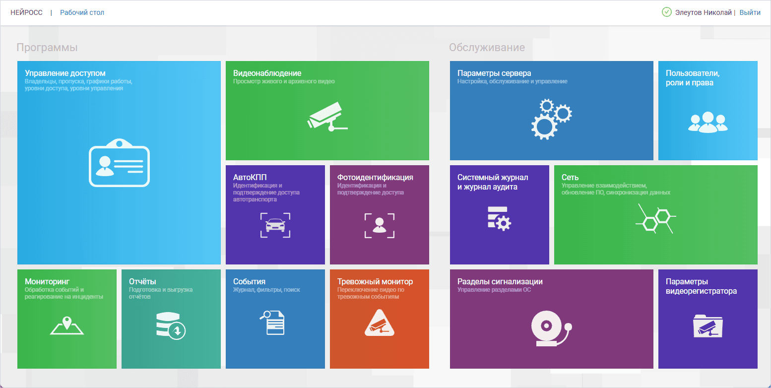 Каждый узел НЕЙРОСС предоставляет пользовательский веб-интерфейс. Доступ осуществляется по IP-адресу узла. С любого мобильного или стационарного ПК посредством любого современного веб-браузера можно выполнять функции конфигурирования, мониторинга состояний и управления. Доступ к административным и пользовательским приложениям НЕЙРОСС осуществляется с рабочего стола НЕЙРОСС. Модуль неисправностей поможет выявить и решить любые проблемы в конфигурировании системы.