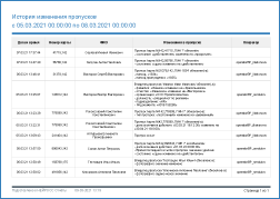 События действий над всеми пропусками системы (выдача, изменение данных пропуска и владельца пропуска), факты изменения состояния пропусков за заданный период времени. При необходимости просмотра действий по конкретному пропуску используйте шаблон История пропуска.