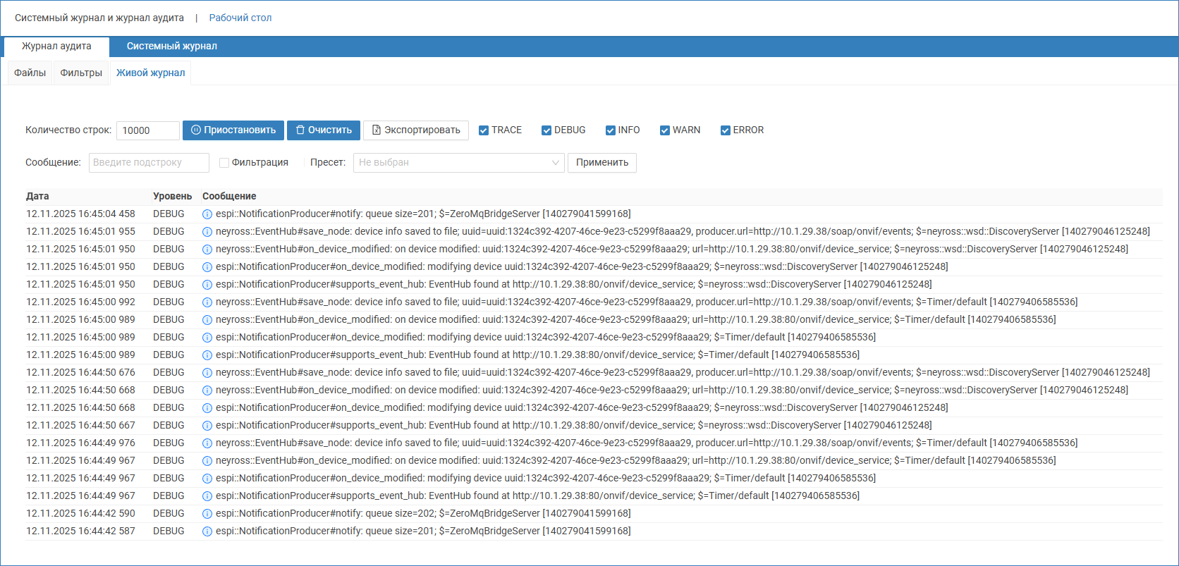 Вы также можете просмотреть логи взаимодействия с медиаисточником в «живом» журнале аудита.
