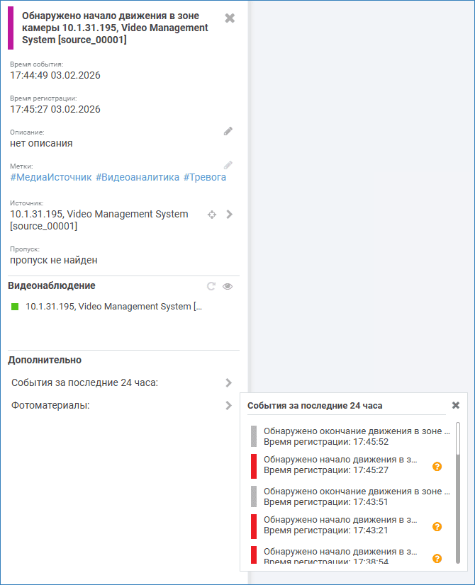 - Получение событий видеоаналитики от встроенного детектора движения и модуля аналитики Tracking Kit 3 с возможностью обработки средствами АРМ Центр, настройки автоматики, записи по событиям и прочее.