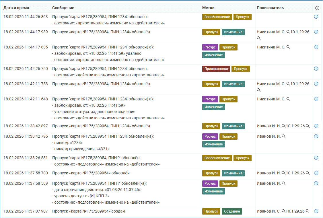 С версии 20.43 Платформы НЕЙРОСС для добавления метки в фильтр Системного журнала достаточно просто кликнуть по соответствующей метке произвольного события. С версии 20.45 добавлен поиск записей по определенному владельцу или пропуску: можно отслеживать изменения данных операторами Бюро пропусков. С версии 20.46 добавлена возможность отслеживания подключений к медиаисточнику по IP-адресу компьютера-клиента.