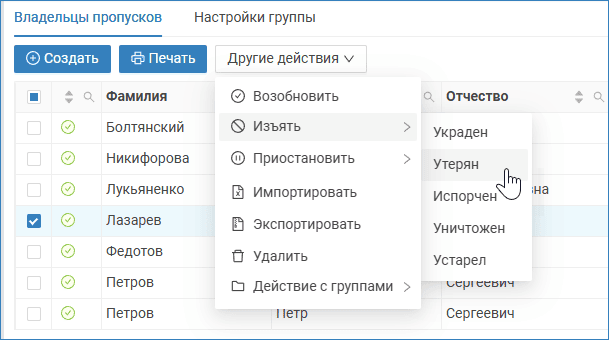 Статус пропуска и его уточнение указывается непосредственно в форме пропуска, например, — Приостановлен (Отгул), Изъят (Утерян). Также поле Уточнение статуса может быть добавлено в таблицу пропусков. Доступна сортировка и поиск по значению уточнения.