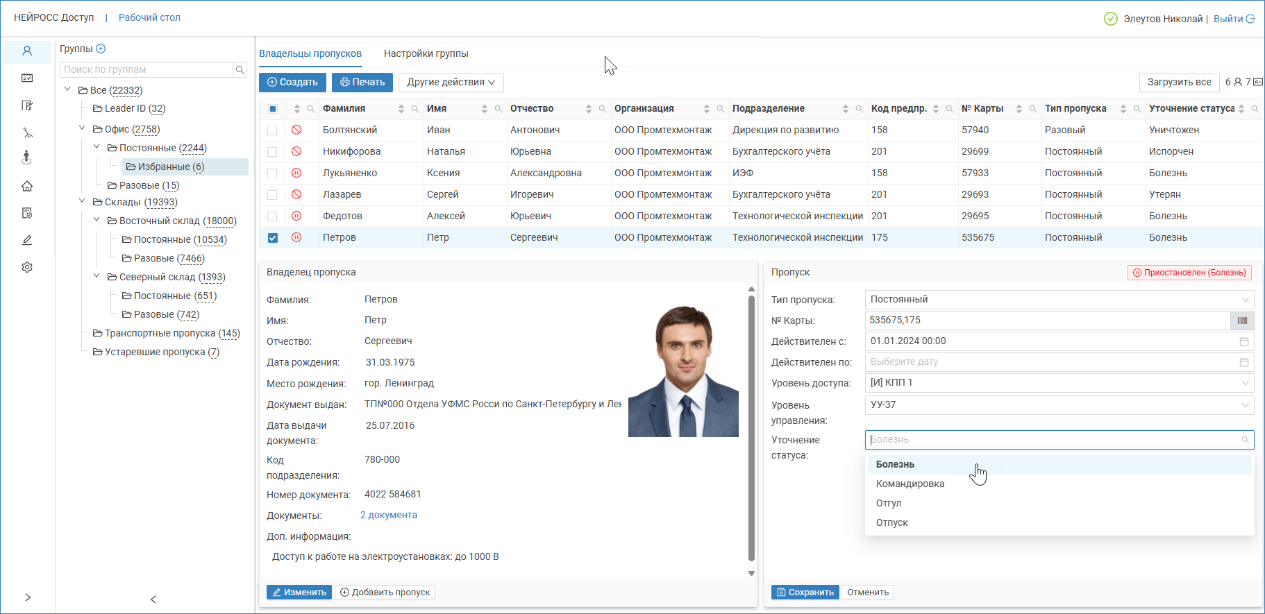 | Изъят | Пропуск удалён из сети НЕЙРОСС либо сдан в бюро пропусков (оператор выполнил команду изъятия пропуска). |