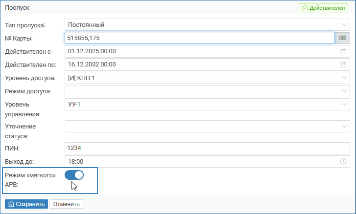 По умолчанию, привилегированный режим не задан. При необходимости включения привилегий установите значение поля Режим «мягкого» APB в значение Включено. Сохраните данные пропуска.