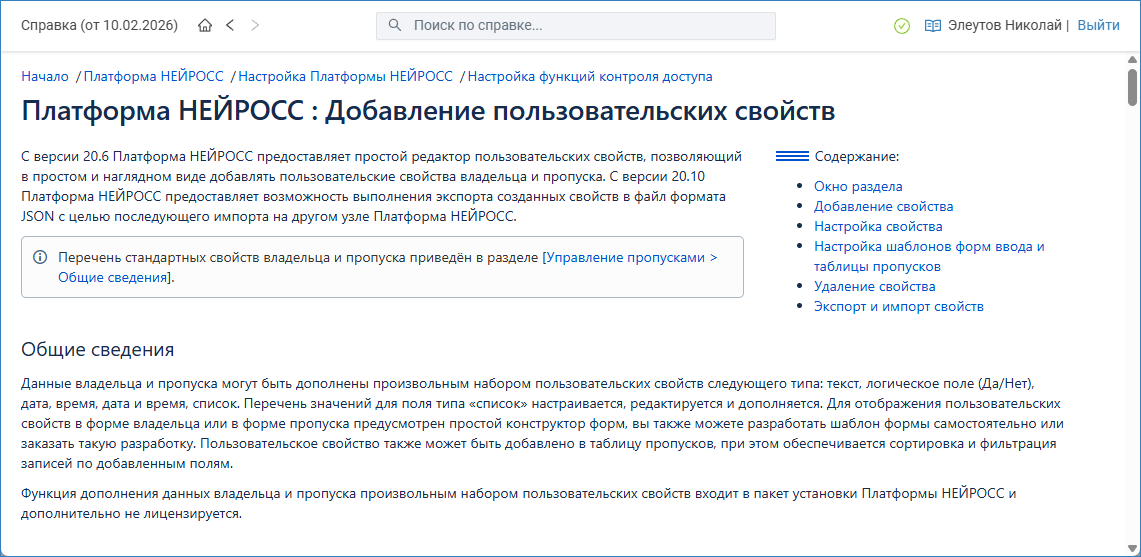Доступ к справке осуществляется из любого приложения НЕЙРОСС. При этом происходит переход к странице справки, относящейся к текущему приложению. Для доступа к справке необходимо быть авторизованным под учётной записью с правом общего конфигурирования [Управление пользователями].