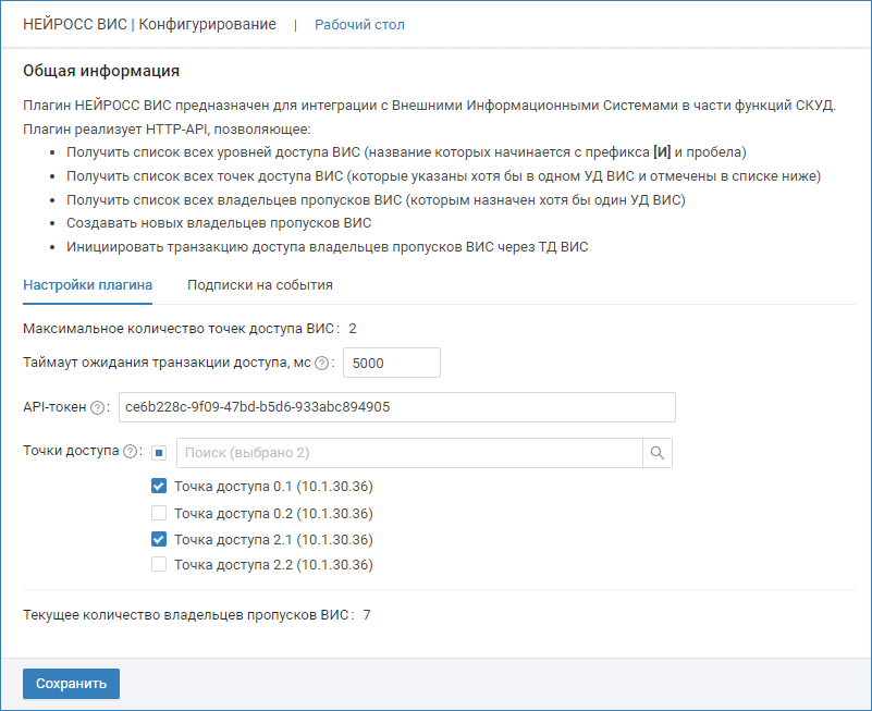 | Точки доступа | Перечень точек доступа НЕЙРОСС, которые будут «видимы» для ВИС и разрешены для транзакций доступа, инициируемых из ВИС. Количество точек доступа ограничивается параметрами лицензии. При выборе количества, превышающего значение в поле «Максимальное количество точек доступа ВИС», вы получите сообщение об ошибке. |